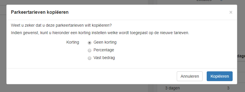 - Pas korting toe op: Starttarief berekend de korting of toeslag door op het starttarief kolom van de prijslijst. Via de optie prijs per dag kunt u de korting toepassen op de prijs per dag kolom van de prijslijst.