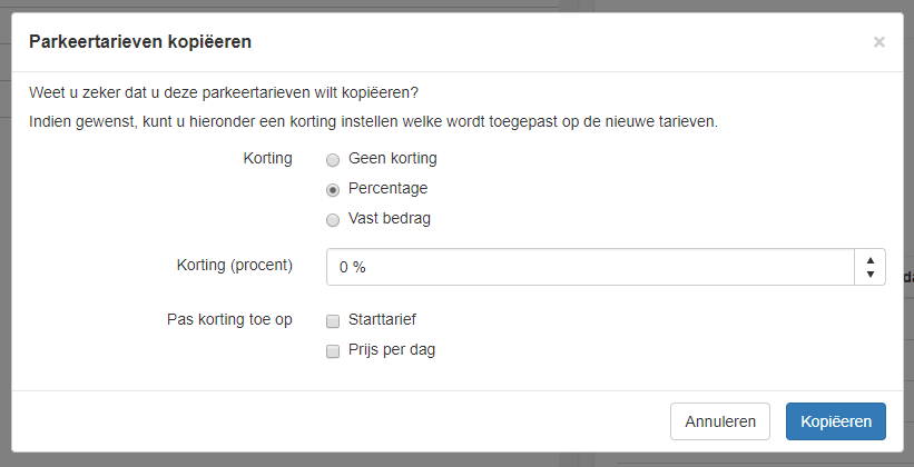 - Korting (procent): het percentage van de korting. Ook kan een toeslag worden toegepast door een negatief kortingspercentage (bijvoorbeeld -10%) toe te passen.