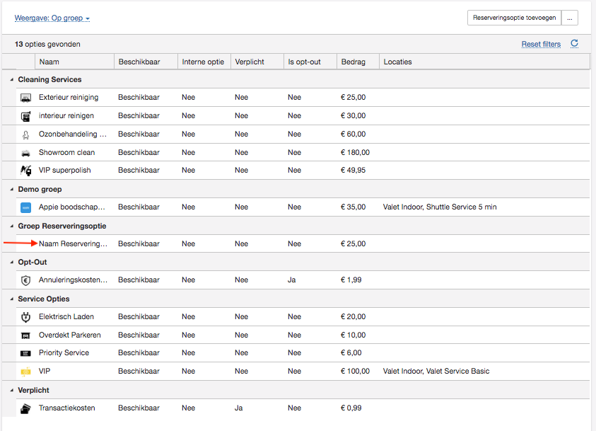 Uw reserveringsoptie is nu te zien in de lijst met reserveringsopties.